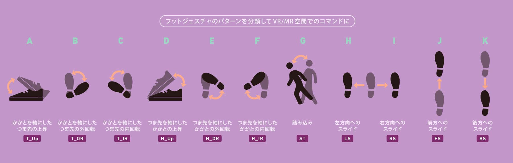かかとを軸につま先を上下左右に回転させる、反対につま先を軸にかかとを上下左右に回転させる、あるいは足を前に踏み出す、前後左右にスライドする、膝を上下させるなど、フットジェスチャのパターンを分類。VR空間で、各々のジェスチャをコマンドとしてオン/オフや値変更などの入力操作を行い、操作性を比較検討した。「例えば、かかとを軸にしてつま先を上下するフットジェスチャはオン/オフのコマンドとして分かりやすいですが、入力を繰り返す必要がある場合には疲れやすいなど、タスクによって適した操作方法を分類しました」